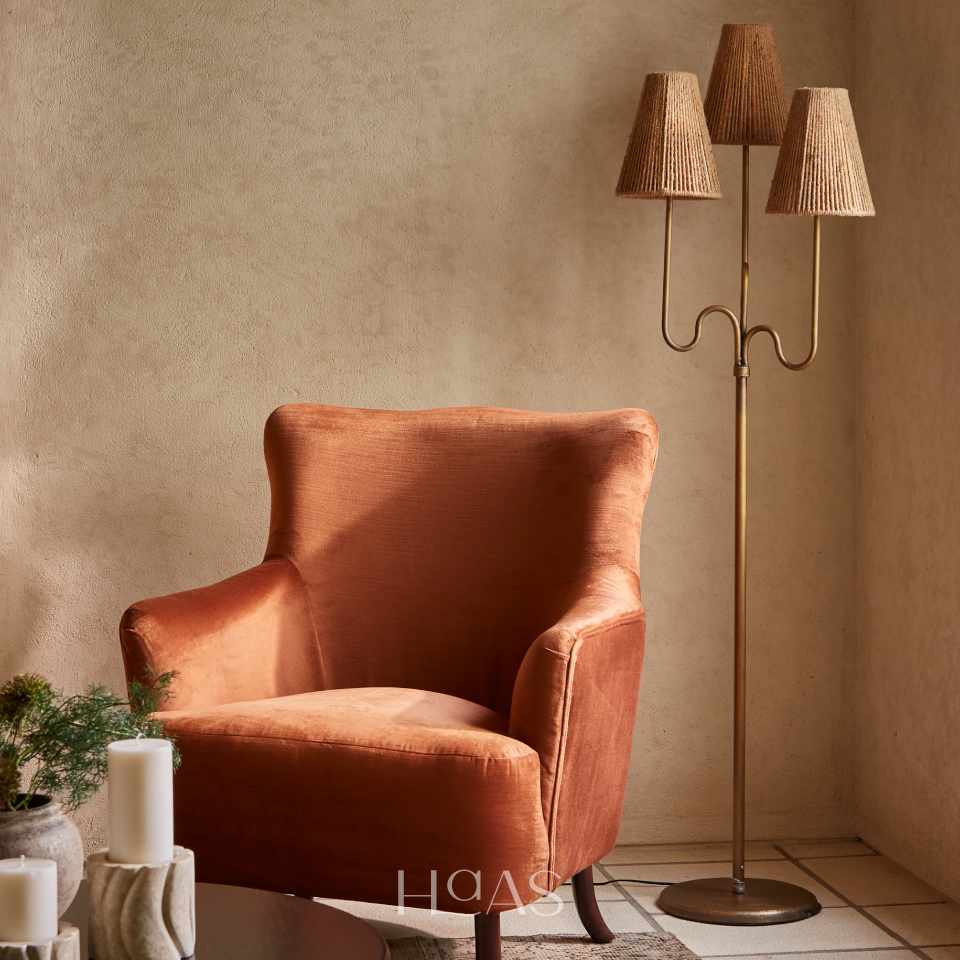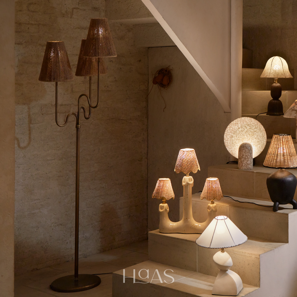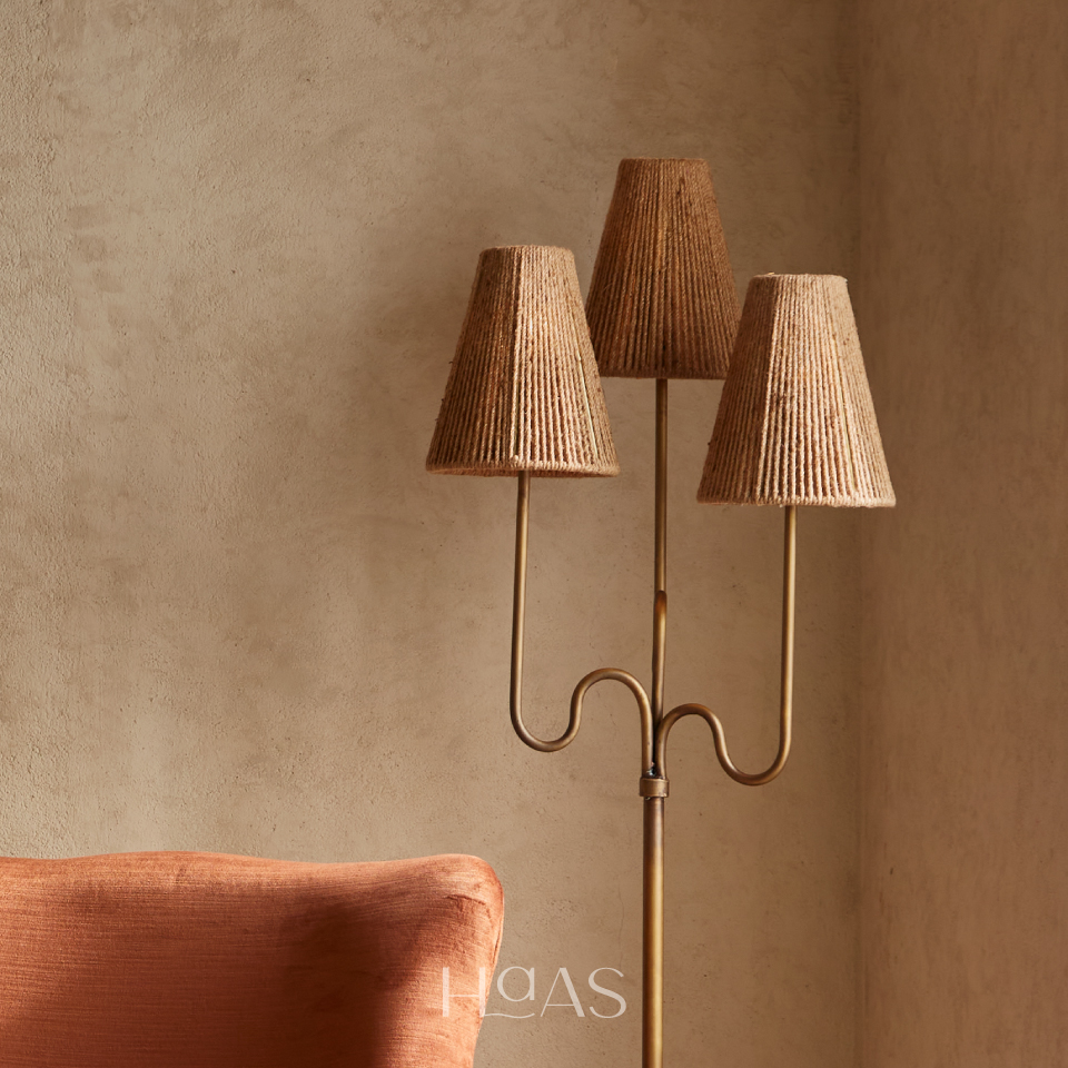 Three brass arms rising like a chorus, each carrying a woven shade. Its stance is rhythm, its glow a voice. Asvara turns illumination into harmony.